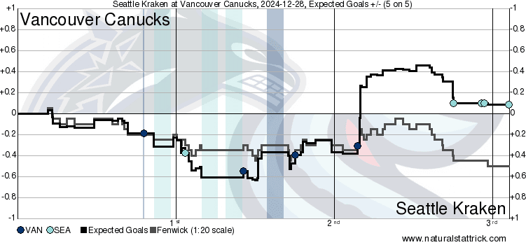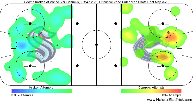 There weren’t a whole lot of scoring chances to speak of in the game at 5v5. Vancouver held a 22-16 overall edge in chances but split evenly in high-danger chances 7-7 with a majority of them coming in the third period. Accounting for all situations, the Kraken held an 11-9 high-danger chance edge and a narrow 25-24 scoring chance lead. It still wasn’t all that much though, and it’s reflected in the heat map where high-danger looks were sparse, and not a lot of attempts were directed at the goals.