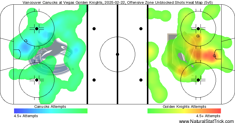 The heat map doesn’t look the most impressive last night for the Canucks either. While their raw chances generated did hit double digits, they weren’t nearly as good in relation to what Vegas was putting up. The Golden Knights accumulated a 31-24 lead in scoring chances with a 14-10 edge in high-danger chances. It shows in their hot spot being a little darker than the Canucks’ right in the slot area. Again, not a horrific difference, and Vancouver did get a good number of opportunities. But their opposition outplayed them and there really isn’t an argument to say that they deserved to win last night.