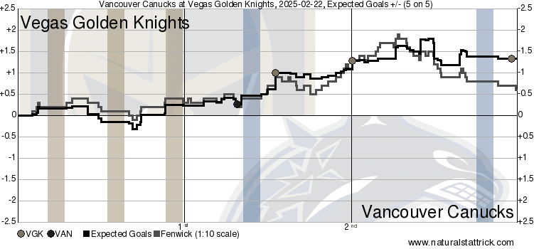 They racked up a huge 1.28 xGF in the frame compared to the Canucks’ 0.43, a difference that the Canucks simply couldn’t overcome. The third was a little better when it came to chance generation, Vancouver managing to accumulate 1.07 xGF in the frame. However, that’s less good when considering that they gave up 1.32 xGA to the Golden Knights to close out the game.