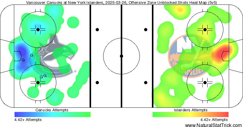 Like Icarus: The forward line of Kiefer Sherwood – Aatu Räty – Dakota Joshua were playing a dangerous game against the Isles. They flew high, tallying a 0.85 xGF, which was the highest amongst any Canuck forward line at 5v5 play. However, by that same token, they gave up a 1.20 xGA, with the next highest line on the team recording a 0.41 xGA. That comes with the territory of giving up five high-danger chances against – but at the same time, no other line recorded close to their five HDCF. It didn’t burn them in this game, but the defensive results were a little of concern. However, when they’re getting that kind of offence… It’s a bit of a double-edged sword.