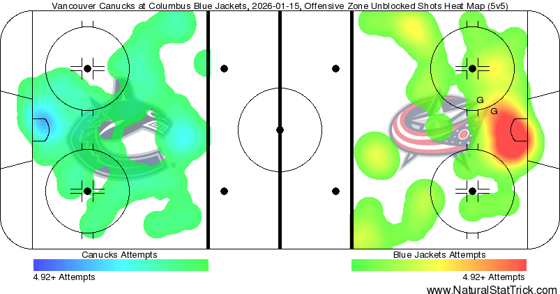 The scoring chances weren’t even close. At 5v5, Columbus had a 37-21 scoring chance lead with a 19-10 high-danger chance advantage. There was absolutely nothing that really went the Canucks’ way in all honesty, and the heat map reflects as much. There was a lake of fire in front of Vancouver’s own net while there wasn’t much to speak of on the offensive side. Not many signs of life, to say the least.