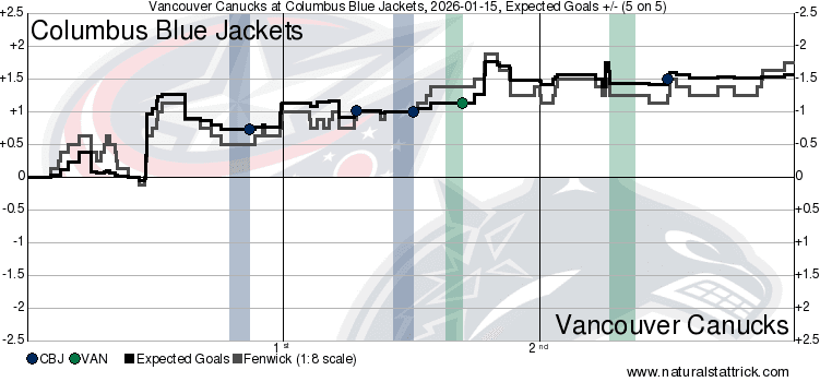 The game flow was heavily skewed towards the Blue Jackets, and for good reason. They started the game off strong, dominating Vancouver to the tune of 62.96 CF% and 67.79 xGF%, racking up 2.15 raw xGF off an 8-3 high-danger chance advantage. That was all they needed to secure a hefty statistical advantage, and they didn’t let the intermission break that momentum either. While the stats would shift relatively more in Vancouver’s favour, Columbus never dropped below 50.00 CF% or 52.00 xGF%, keeping the Canucks very much at bay and on the back foot. And as has been the case all road trip, the Canucks simply didn’t have an answer when challenged whatsoever.