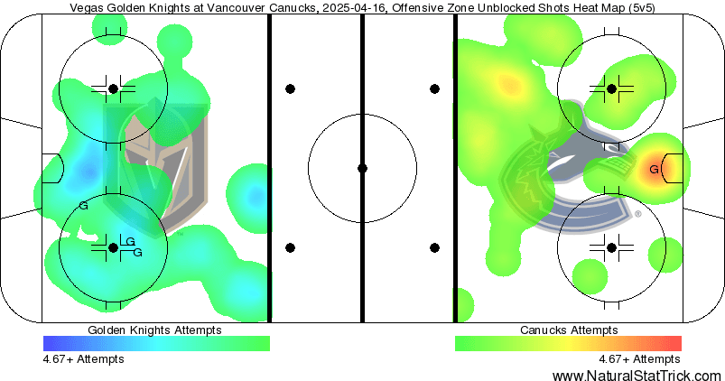 The heat map doesn’t look awful. The scoring chances were only at 18-16 for the Golden Knights, with the visitors also holding a 7-6 edge in high-danger chances. However, the concerning part comes in the distribution of these chances. Vancouver got five of their HDCF in the first, which meant that they would only post a single HDCF for the rest of the game. Vegas tallied five in the middle frame and one in the third, with the Canucks not managing to get a single HDCF in the final frame when they should’ve been pushing to get back into the contest. It was as the momentum suggested – Vegas took it to the Canucks and they simply didn’t have an answer.