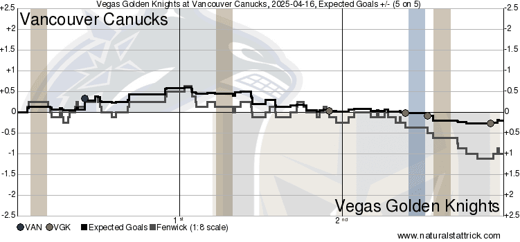 The game looked like it would be the Canucks using up the last of their juices in this contest. They opened up the first period with a 62.50 CF% and 71.61 xGF% with a 5-1 edge in HDCF, dominating them and deservedly grabbing the first goal of the game. But after that, the wheels just kind of fell off the train. Vancouver would go on to record a 26.68 xGF% share in the second and a 34.35 xGF% share in the third, while not breaking 50.00 CF% in either period, either. That was more than enough for Vegas to capitalize, roaring back with four unanswered goals to see this game out.