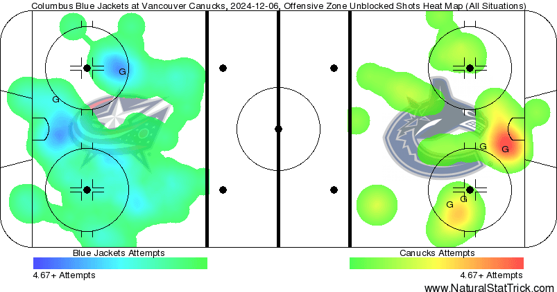 For a game where the Canucks were out-chanced heavily, the heat map doesn’t actually look that bad. Yes, Columbus is all over the place in the offensive zone, but they weren’t able to establish a clear hot spot from a truly dangerous area. At 5v5, the scoring chances stood at 25-13 for the Blue Jackets, while the high-danger chances were 9-7 for them as well. Across all situations, those numbers jumped to 35-20 and 11-11, but it was Vancouver that created the slightly better hot spot from right in tight against Elvis Merzlikins. It’s not a bad outcome for a rough start.