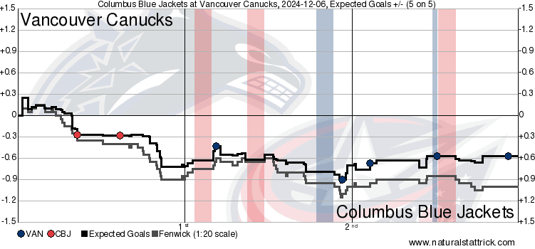 The Canucks were on the back foot possession-wise the entire night. That comes when you’re as heavily as outshot as they were in the first period, seeing only a 25.64 Corsi For percentage (CF%) share to open up the game. Vancouver also posted a 25.43% expected goals-for percentage (xGF%) while giving up 1.11 expected goals against (xGA), so it was a deserved lead that the Blue Jackets took with them into the second period. However, while the Canucks would never break the 50.00 CF% mark, they started playing smarter hockey. They were able to limit Columbus a lot more in the second and third periods, capitalizing on the opportunities they got along the way. The xGF% in the second period sat at 50.88%, while the Canucks would close the game out with a 60.26 xGF% in the third period.