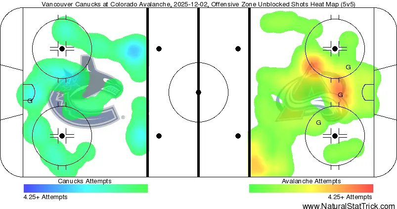 The heat map actually doesn’t look as bad as one might think. While the Avs did win handily, they really only had one period where they were clearly the better team. The overall scoring chances did stand at 27-19 for Colorado, with an 11-4 edge in high-danger chances. They had a light dusting of red right in the slot area to reflect that, but it wasn’t as dominant as one might’ve thought it would be. Relatively speaking the Canucks did a good job of limiting the chances against – the problem was that they didn’t get many chances of their own.