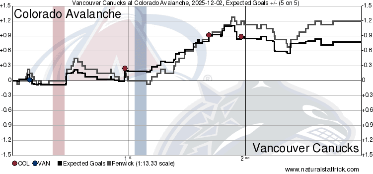 It should track pretty well that the period where the game hung most in the balance was the one where Vancouver and Colorado were tied 1-1. The Avs would finish the frame with slight edges in both share metrics, but the first period also saw the Canucks generate their best xGF in a single period this contest at 0.56. That isn’t the most impressive number in the whole world, but they still managed to find the scoresheet which was all that mattered. However, the second period saw Colorado seize the initiative, holding massive 68.42 CF% and 70.81 xGF% shares, a 1.12 xGF to their name as they scored twice to push the game to 3-1. That was how it finished, as the Canucks simply did not have the juice to overcome that second period surge.