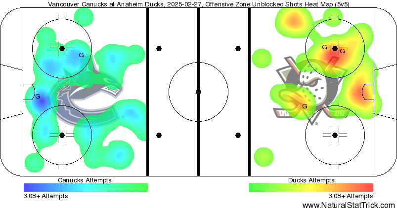 The heat map flatters the Canucks a bit, but make no mistake – Vancouver is not a good offensive chance generating team. That’s probably not a revolutionary fact, but between the Kings game and the Ducks game, they’ve combined for a total of 7 high-danger chances at 5v5 play. Last night, it wasn’t high-event hockey, with Anaheim racking up a limited 18-15 lead in scoring chances. However, whereas they managed 9 high-danger chances at even strength, the Canucks only had 5 with the large chunk of them coming in the first period. Vancouver would also only manage to create a single high-danger chance on the man-advantage as well. Simply put, it isn’t good, and it’s a pattern that’s been going on since the start of the year.