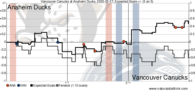 The first period was promising enough. Vancouver played well, getting themselves up 2-0 off the backs of an early penalty kill. They would finish the opening frame with a 54.17 CF% and 62.16 xGF% share, putting up a 0.63 xGF in the period alone. But after racking up three high-danger scoring chances in the first, the Canucks would go on to record just two more combined in the second and third. Their feet didn’t just come off the gas pedal – they left the vehicle entirely. Vancouver would only be able to accumulate 0.75 xGF for the rest of the game, Anaheim taking a massive 59.08 and 73.19 xGF% shares in the second and third respectively to put a stranglehold on the game. The third is particularly alarming, as though it should’ve been the Canucks pushing to get back into this game, they looked limp while the Ducks ran circles around them.