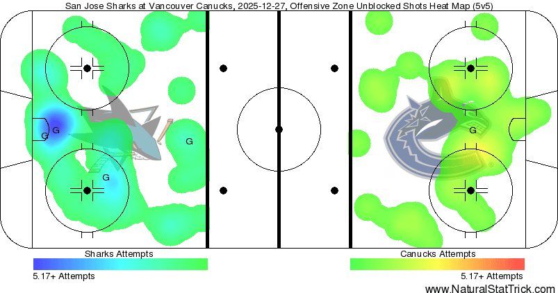 Just from the heat map alone, it’s apparent that the Canucks were not threatening whatsoever. Both teams struggled with scoring chances, with San Jose sitting at a 20-18 advantage but still doubling up on Vancouver by a 10-5 margin in high-danger chances. It’s just a hard watch when this team can’t even manage to get scoring chances, much less grade-A opportunities. The Canucks simply don’t have enough difference makers in their lineup to make something happen, and the stats have backed that up all season.