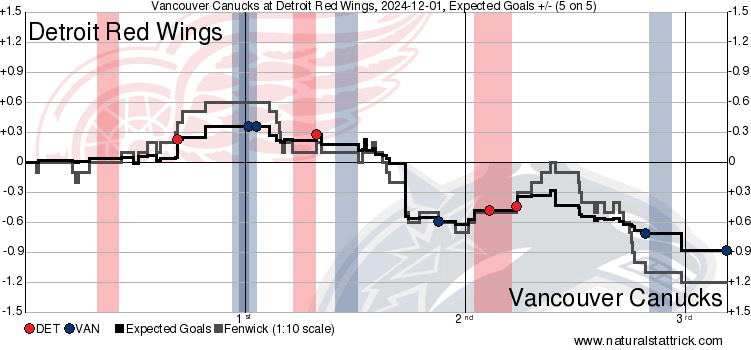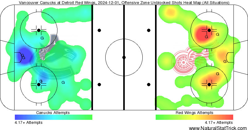 See what happens when you create chances? This game for the Canucks demonstrated that they could indeed create offensive looks and high-quality ones at that, with a 21-11 lead in scoring chances at 5v5, which translated to a big 10-3 high-danger chance advantage. What stood out in this one was that Vancouver was also getting opportunities off power plays as well – over all situations, their scoring chance lead shrunk to 35-30, but their high-danger chances grew, to 17-9. That’s not bad, considering that Detroit wasn’t exactly without power play opportunities themselves.