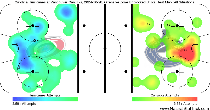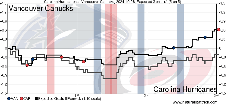 One thing that Vancouver did well last night was getting high-quality looks. Despite Carolina having a 25-23 edge in scoring chances, it was the Canucks that doubled up on them 12-6 in high-danger looks at even strength. That much is reflected in the heat map, where Vancouver had a far better hot spot than the Canes, both in a better area and deeper in colour. However, this heat map also highlights an issue that’s been present in the last couple of games – the Canucks can’t do anything on the power play. In total, Vancouver only managed 1 high-danger chance on the man advantage, which simply isn’t good enough. It’s apparent that they aren’t managing to generate much offence during the special teams from the heat map, and coupling that with the lack of momentum off power plays illustrated by the game flow, and represents a lost opportunity for this team.