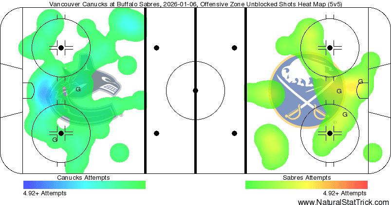 Vancouver actually put up a good heat map against Buffalo, which is yet another game in a row which this has happened. At 5v5, the scoring chances were 23-18 with the Canucks posting a narrow 9-7 lead in high-danger chances. These numbers get inflated to 45-19 and 23-8 respectively for the Canucks when accounting for all situations, but again, the majority of those opportunities came with the man advantage – something Vancouver simply could not capitalize on. It’s certainly better than losing snoozefests, but the theme remains clear that the Canucks aren’t managing to hit the back of the net on relatively ineffective special teams, and play relatively flat at 5v5 the rest of the way.