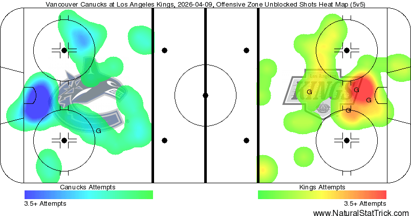 The heat map actually looks pretty solid for the Canucks, ignoring the fact that they couldn’t convert on a single one of their high-danger chances. Scoring chances for both teams were evenly split at 24-24 during even-strength play, with the Kings ever so slightly edging the Canucks out 14-11 in high-danger chances. But hey, Vancouver managed to actually total over double digits in high-danger chances, so that in and of itself is pretty nice to see. Unfortunately, as mentioned before, nothing really came of it offensively for the Canucks, but being able to get a good amount of high-danger chances in a single game is definitely nice to see.