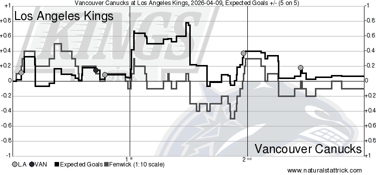 For the most part, this game hung in the balance. Granted, the peaks of the contest definitely favoured the Kings, but the Canucks at least showed some ability to claw the momentum back in their favour from time to time. The CF% shares all hovered around the 50s for each period, with the Kings stacking together a 51.35 xGF% in the first and 56.53 xGF% in the second to get themselves in the lead. After that, they shut things down, as while the Canucks managed a 71.45 xGF% in the third, their raw xGF was only at a 0.56 at 5v5 action with just three high-danger chances to boot. Los Angeles was definitely not in the business of letting Vancouver back into this one when they had a Wild Card spot to play for.