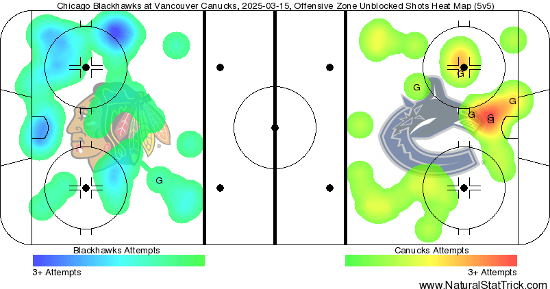 Vancouver did not have a great night when it came to chance generation. Chicago held a 19-16 edge in overall scoring chances at 5v5 play, while the high-danger chances were split 6-6 between the two teams. From the heat map though, it was clear that the Canucks did a much better job in converting those high-danger chances than the Hawks did, making a world of difference on the scoresheet. Again, while the raw numbers aren’t the best, Vancouver buried on the ones that they got which is what matters in the end.