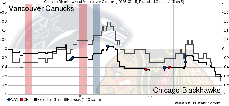 Aside from a little surge in the second period, the game flow was pretty firmly in favour of the Blackhawks the majority of the night. The only period where the Canucks held a positive CF% share was the first period, and they didn’t manage to break 40.00 xGF% until the third period’s 43.65 xGF%. Suffice it to say that despite the score, Vancouver wasn’t handily dominating their opposition. But that was alright, given that they scored against the flow of the game and capitalized on the opportunities that they got. For all the numbers they put up, the Blackhawks weren’t able to deliver on much of them at all.