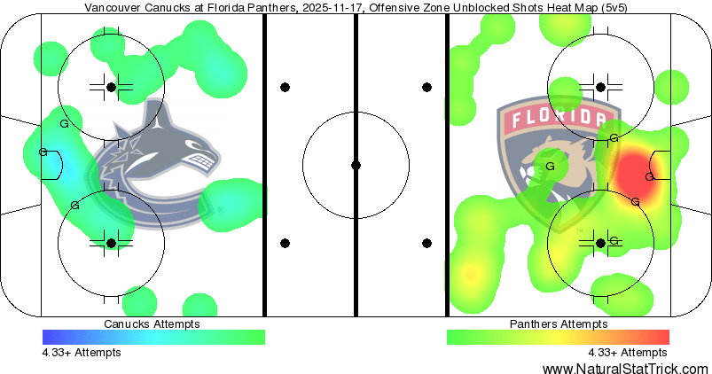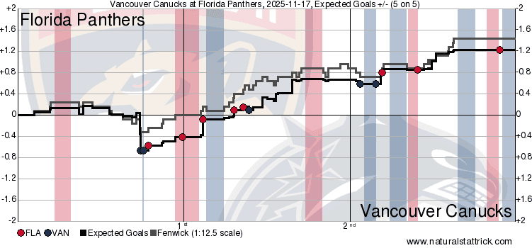 Florida turned up the heat on Vancouver in this one. The Cats finished with a 28-15 advantage in scoring chances and a 12-5 margin in high-danger chances. All of Vancouver’s high-danger chances came in the first period, with the team unable to get too much offensive traction for the rest of the contest. At least they were able to claw some goals out from other areas and on special teams, but the Canucks definitely didn’t have a sustainable plan for offence. As for the Panthers, they scored in bunches, and ideally, Vancouver just doesn’t bleed that many chances for as long as they did against quality opposition.