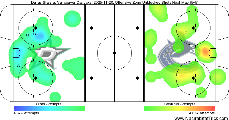The heat map also reflects how deadlocked this game was from a scoring chance perspective. Overall, the Canucks had a slight 23-21 edge in scoring chances, while the Stars posted an 8-6 lead in high-danger chances at 5v5. The similarities in their hot spots show just how close these metrics were, and the biggest reason Dallas was able to take this contest was that they capitalized on four even-strength chances. Not to say Vancouver played poorly – they just didn’t bury like their opposition.