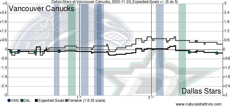 This game remained in the balance throughout. Vancouver did pretty well for themselves statistically, managing to hold the lion’s share of CF% through the first and second periods. Now, that didn’t result in a lead, but playing against a team like the Stars, it’s a pretty tidy accomplishment. It was solid, defensively astute hockey from both sides, as neither team really managed to generate too many high-danger scoring chances. The first saw a 1-1 split, the second was a 2-3 edge for Dallas, and a 4-3 lead in the third for the visitors as well. But, in the grand context of the game, it wasn’t as if that was particularly costly for the Canucks. It was a well-fought-out effort, and it is unfortunate that they came up short.