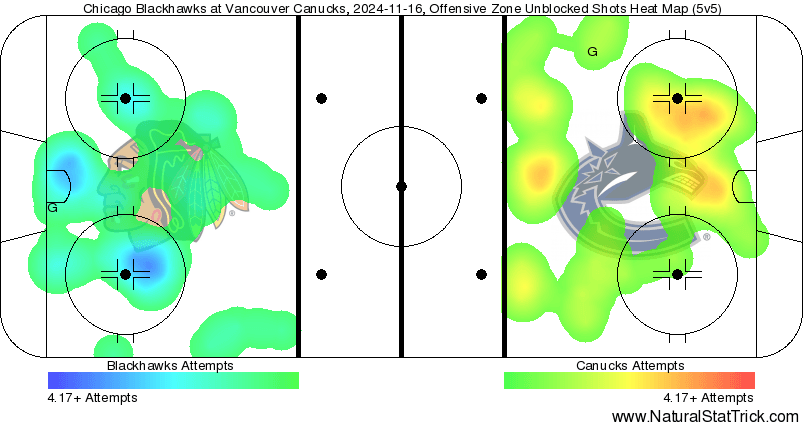 Despite the win, Vancouver’s issues when it comes to chance generation continued against Chicago. They had a narrow 22-21 lead in total scoring chances at 5v5, with just a 9-8 high-danger chance edge to go along with it. That much is reflected by a relatively tepid heat map, where they didn’t get much of a hot spot at all from the slot area. On the flip side, the Canucks held up their end of the bargain on the defensive side, not allowing Chicago to create their high-danger hot spot either. That however should be the expectation when playing against a team like the Blackhawks.