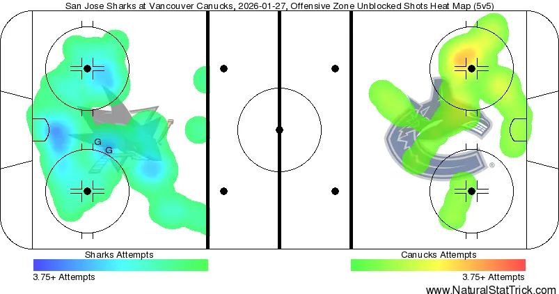Given how the expected goals shaped up for this team, it shouldn’t really be a surprise to see such an anemic heat map from the Canucks. At 5v5, they were hammered by a 31-12 margin in overall scoring chances, with San Jose managing an 8-3 lead in high-danger chances. Of course, only giving up 8 high-danger chances isn’t the worst thing in the entire world relative to the 31 overall chances that were conceded, but those gaps were not good. That much is shown in the heat map, where San Jose at least managed a smidgen of a hot spot from the low danger areas, while Vancouver didn’t have much of anything at all.