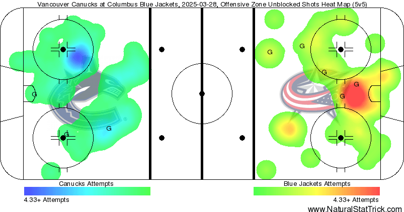 Things don’t get much better when looking at the heat map. The Blue Jackets were all over the shop, holding a big 13-4 HDCF edge on just a 20-18 overall scoring chance lead at 5v5 play. Essentially, Columbus was able to get a big chunk of their scoring chances from high-danger areas, with the Canucks unable to prevent that or respond in kind. That led to the graphic displayed above, with a big hot spot right in the slot area for the Blue Jackets, while the Canucks really didn’t amount to anything.