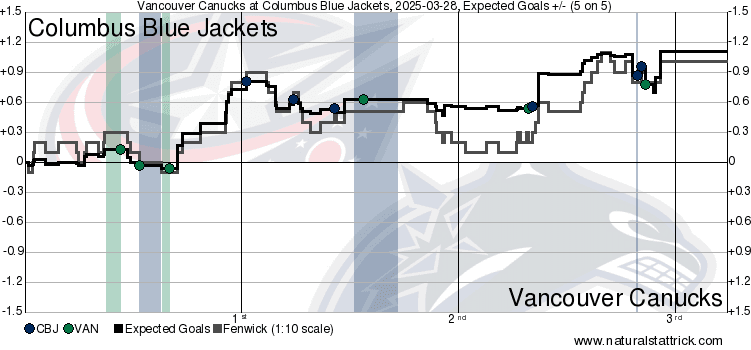 The game started off in exciting fashion for the Canucks. Three quick markers while the flow was back and forth between the two teams allowed them to leap right into the lead. However, after that, they let Columbus take over the game to the tune of 62.07 CF% and 76.31 xGF%, with the Blue Jackets racking up five high-danger chances and 1.04 xGF at 5v5 play. It was that momentum the Blue Jackets carried into the second period, knotting the game up before the Canucks found a short-handed tally. The third was similar to the first – Columbs might’ve only had 40.00 CF%, but they managed to tally 65.50 xGF% on 1.16 xGF in the frame. Suffice it to say, it was hard to find a point in the game where the Canucks had absolute control statistically.