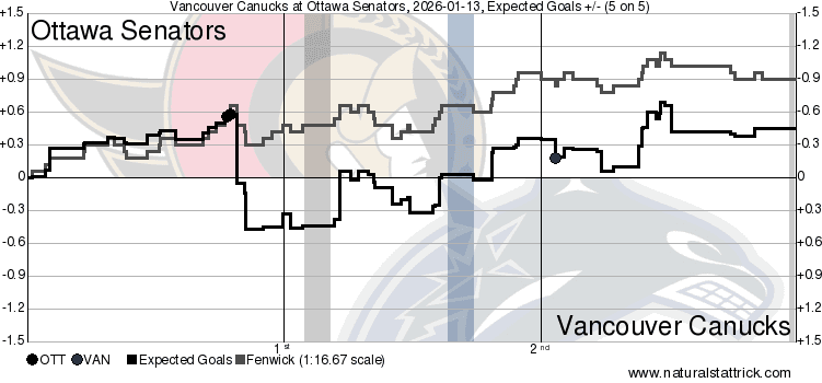 The first period started out pretty heavily in favour of the Sens, with Ottawa scoring twice in quick succession after a stretch of good play. However, that seemed to be the wakeup call the Canucks needed, as they picked up the pace in a big way. By the end of the period, Vancouver held a 1.2 xGF for a 58.14 xGF%, looking like they would make a good push through the rest of the game to get themselves back into it.