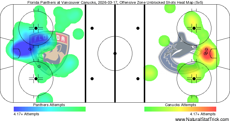 Just from the heat map, it was apparent that Vancouver was heavily outchanced. The Panthers had a 22-17 shot advantage at 5v5, held a 31-17 lead in overall scoring chances and a massive 18-10 edge in high-danger chances. Nine of those 18 came in the first period, which fortunately the Canucks managed to stave off for the most part. The teams were actually on even footing in the second in HDCF, standing at a 3-3 battle, before the Panthers edged the Canucks out 6-4 in the final frame. Still, despite all of these statistical advantages, Florida only managed to strike twice, while the Canucks held out and converted on the couple of chances they got to get the win.