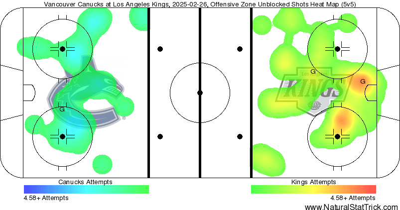 The heat map highlights the Canucks’ shortcomings in the offensive zone. While the overall scoring chance battle only stood at 25-18 in favour of the Kings at 5v5, the high-danger chances were a staggering 12-2 for the home team. Vancouver didn’t even come close to securing a hot spot in the slot area, with 2 high-danger chances coming all in the first period. This was while the Kings got almost half of their scoring chances as high-danger chances, with the difference only growing to 16-3 when accounting for all situations. Simply put, Vancouver did not put in the effort needed to win at both ends of the ice last night.