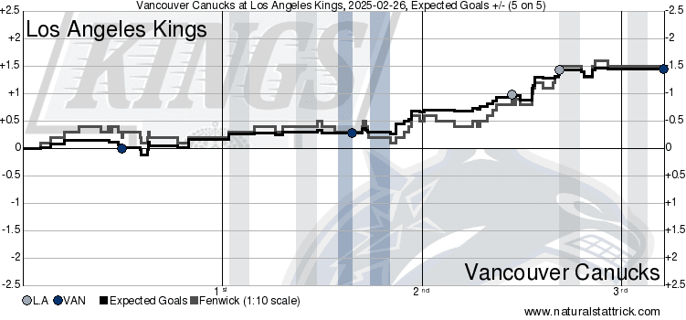 For a large chunk of the game, things hung in the balance. The Corsi ever so slightly favoured the Kings through the first and increased in the second, and LA was able to translate that into expected goals and offensive pressure. Once they went down 2-0, it cranked up a notch. The Kings held a 78.06 xGF% share to close out the second before putting up 1.09 xGF and 77.68 xGF% in the third alone. In total, LA accumulated nine high-danger chances between the second and third periods, while in that same span the Canucks didn’t manage to grab a single high-danger chance themselves.