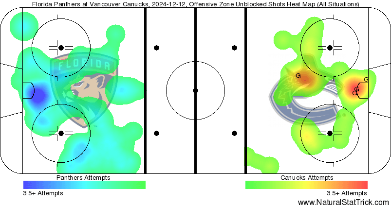 Interestingly enough, given the disparity in the share metrics, the heat map doesn’t look nearly as bad as one might expect. The scoring chances only ever so slightly favoured Florida by a 20-16 margin, while the high-danger chances stood at 9-5 for the Panthers at 5v5. When accounting for all situations, each team posted 1 more scoring chance, and the Canucks actually managed to shrink the high-danger chance deficit to just 9-6. The Canucks got three of their four goals from near that hot spot they had from in tight, and defensively they did a very good job in preventing Florida from racking up a ton of good looks despite giving up a lot of the puck.