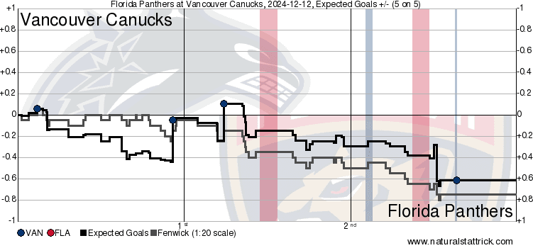The first period was probably the closest the Canucks got to evenly splitting a period. Posting a 41.67 CF% and 48.73 xGF% share, Vancouver managed to get a 2-0 lead out of that. After the opening frame though, the Panthers turned it on. In the second, they recorded a 66.67 CF% – in the third, that jumped to 82.35 CF%. The xGF% favored the visitors too, seeing them record a 59.66 in the second period, before really pushing for the equalizer in the third with a 71.15 xGF%. But, as the scoreboard evidenced, they weren’t able to find that icebreaker at all.