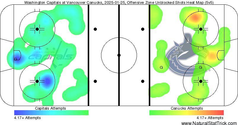 The heat map once again favoured the opposition, but at least it wasn’t as bad as previous outings. Washington dominated the scoring chances to the tune of 29-18 at 5v5, but only managed a 10-7 edge in high-danger chances against the Canucks. Proportionally, that is a pretty darn good defensive performance by Vancouver to limit the grade-A chances that they faced. As for themselves, the Canucks didn’t get a ton of chances but a good chunk of them were registered a high-danger. Again, proportionally, it’s a fine job at even strength especially considering the quality of their opposition. Both teams managed just 1 high-danger chance for on their powerplays, while the Caps added another one in the dying moments of the game.