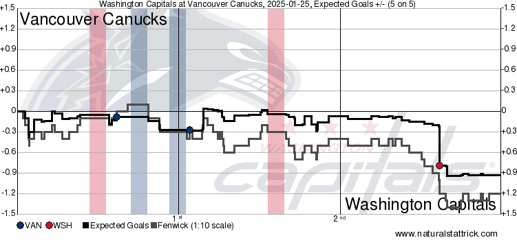 The first two periods were a pretty even battle. Washington and Vancouver took turns trading slight advantages in both Corsi and expected goals in a pretty back-and-forth tilt. After the last stretch of games for the Canucks, a game like this through two periods was honestly quite the accomplishment. However, the third saw the Capitals crank it up a notch, looking to equalize and win this game on the road. Their CF% of 66.67 and xGF% of 88.31 showed just what kind of effort they were putting up to get themselves level, but unfortunately for them, they ran out of time.