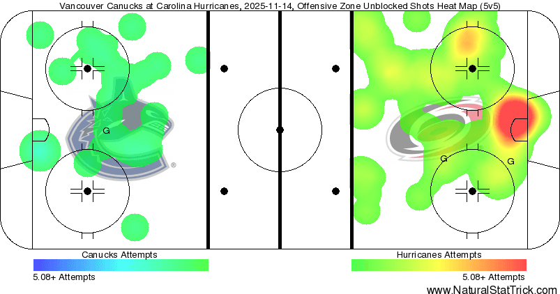 Again, this is genuinely unprecedented when it comes to a heat map. The sheer amount of chances that the Canes had was stupid. At 5v5 play, the margin was 44 to 9 for the home team. That’s right, Carolina had nearly five times the amount of total scoring chances at even strength play that Vancouver had. It’s just embarrassing at that point. Naturally, with such a big gap in total scoring chances, the high-danger chances were equally lopsided. The Hurricanes posted 21 high-danger chances in comparison to Vancouver’s 2. It’s hard to imagine anything going worse.