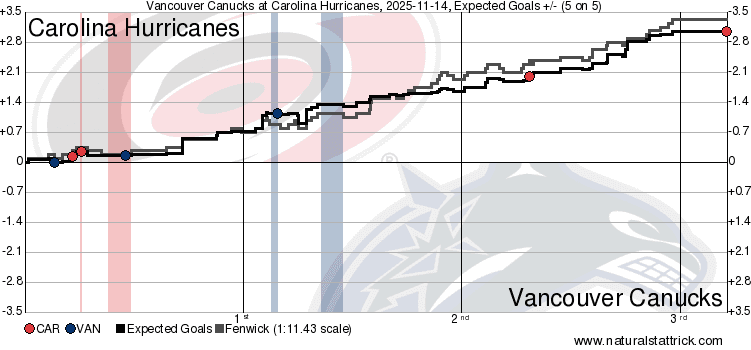 I have genuinely never seen anything like this. The entire game was so thoroughly dominated by Carolina that the stats have to be seen to be believed. Just one glance at the Y-axis tells us how big the margin was for both Corsi and expected goals, with Vancouver never even appearing to play the same game as their opposition. At 5v5, the Canucks finished with 20.91 CF%, 8.70 HDCF%, and 17.12 xGF%. Vancouver might as well not have shown up with those share metrics, managing a paltry 0.80 total xGF at even strength. That would’ve been fine had they either played solid defence to limit the Canes, or had offset it through some special teams production. Instead, they did neither.
