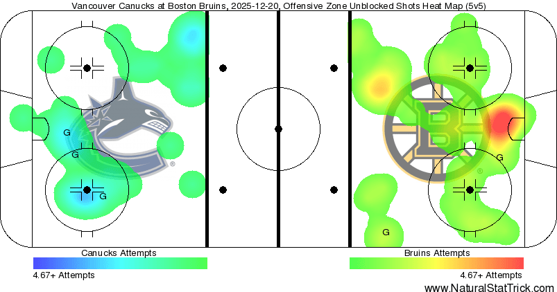 Again, given the disparity in share metrics, one would expect the heat map to look a lot worse. Vancouver did a good job limiting the damage: despite being out-chanced 26-12 at 5v5, the HDCF battle was only 11-6, which was pretty darn good given the circumstances. The Canucks also capitalized more at 5v5 than the Bruins, which definitely helped matters when it came to responding to all the swings Boston took at them.