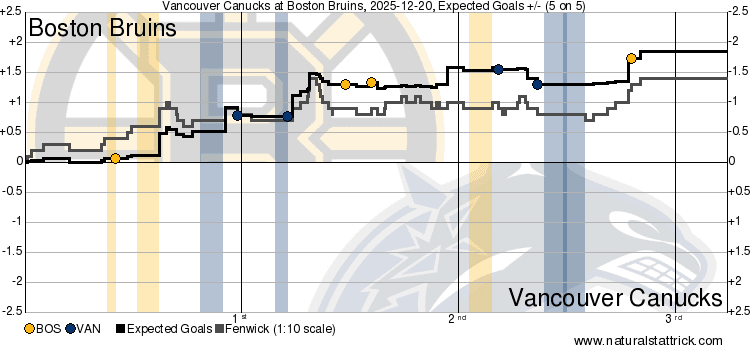 From the game flow, it seems Boston had the steady upper hand throughout the entire game. While they didn’t have the lion’s share of both CF% and xGF%, the Canucks actually did a pretty good job when it came to limiting the damage the Bruins could do. Giving up just 11 HDCA when they finished with just 38.89 CF% and 27.41 xGF% is definitely not the worst outcome in the world. Vancouver did a good job of riding out any of the momentum that Boston managed to swing their way, catching them in lulls to strike on the scoreboard.