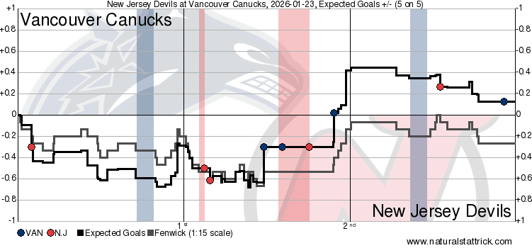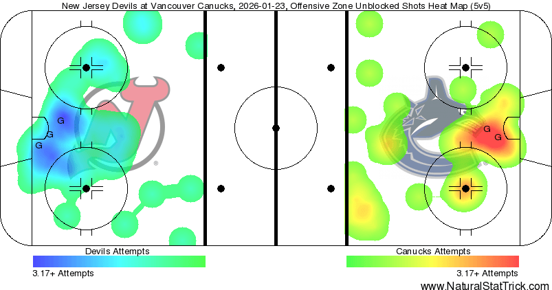 The heat map wasn’t the worst thing in the world. In total, the scoring chances favoured the Devils 25-19, but the Canucks led 10-8 in high-danger chances. That much can be seen in how spread out New Jersey’s hot spot was, but the Canucks were more concentrated and dense right in the low slot area. Again, not the worst by any means, and considering how this game started, it probably could’ve gone a lot worse. Vancouver’s six high-danger chances in the second certainly helped buoy a lot of this heat map as well.
