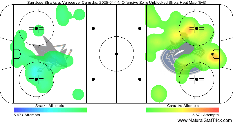 The heat map also doesn’t look the most impressive until considering the scale at the bottom of the graphic. Overall, the Canucks had a 27-14 edge in scoring chances, with a further 11-4 lead in high-danger chances. The disparity between the two teams can be seen in the fact that the Sharks simply didn’t have a hot spot to begin with, while the Canucks managed to register one that was on the upper-middle end of the scale. Of the 11 HDCF, nine of them came in the first two periods, with just two in the final frame. That’s probably not what the team wanted, but at least one of them led to a goal. The gap only stretched when accounting for all situations as well – Vancouver had a dominating 54-18 scoring chance lead and 24-5 high-danger chance advantage. They should’ve blown the Sharks out.