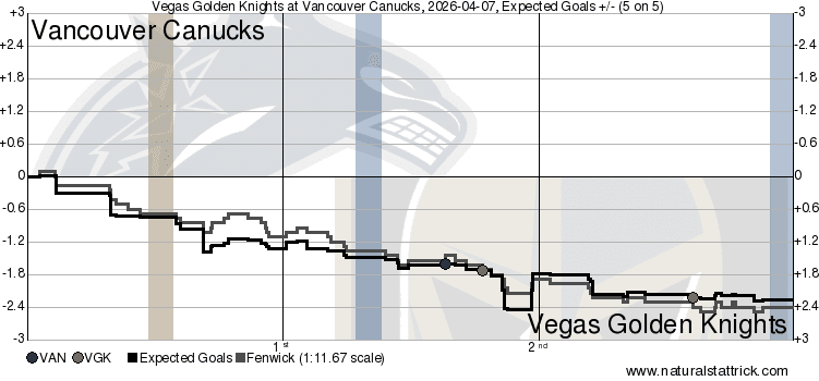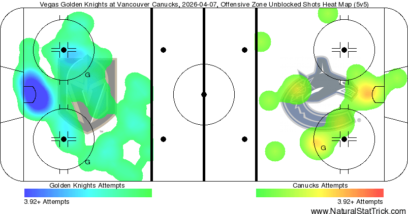 The heat map is a pretty good visualization of how bad things were going for the Canucks last night. Yes, they were outshot 28-11, which isn’t ideal no matter how you cut it, but the 5v5 scoring chances were also not pretty as well. They were doubled up on by the Golden Knights by a 28-14 margin, and were tripled up on in high-danger chances at 13-4. It’s just not good hockey at both ends of the ice, and while you could argue that Vegas should’ve made Vancouver pay more, the numbers relative to each other simply were not good enough from the Canucks perspective.