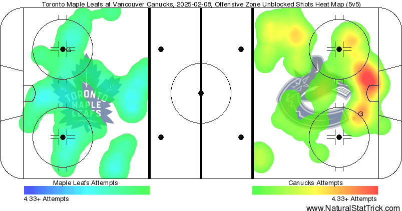 That expected goals dominance translated into the heat map. Vancouver demolished Toronto in scoring chances by a 27-19 margin at 5v5, holding the Leafs to just four high-danger chances while racking up 10 of their own to produce quite the hot spot in against Joseph Woll. The special teams held up their end of the bargain, too, with the Canucks producing three high-danger chances and holding the Leafs to nothing. Considering that the Sharks game was nearly the inverse of this, it’s a pretty darn good result against much better competition than San Jose.