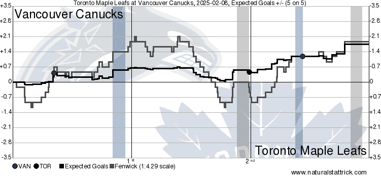 It was a very impressive performance by the Canucks. They didn’t let the game slip past them, consistently generated chances, got a good amount of them from high-danger areas, and closed the game off by making sure the Leafs couldn’t get anything going. It was complete in pretty much every regard and a good bounce back from where the Sharks performance left them. Two 2-1 scorelines but the games couldn’t have been more different content-wise.