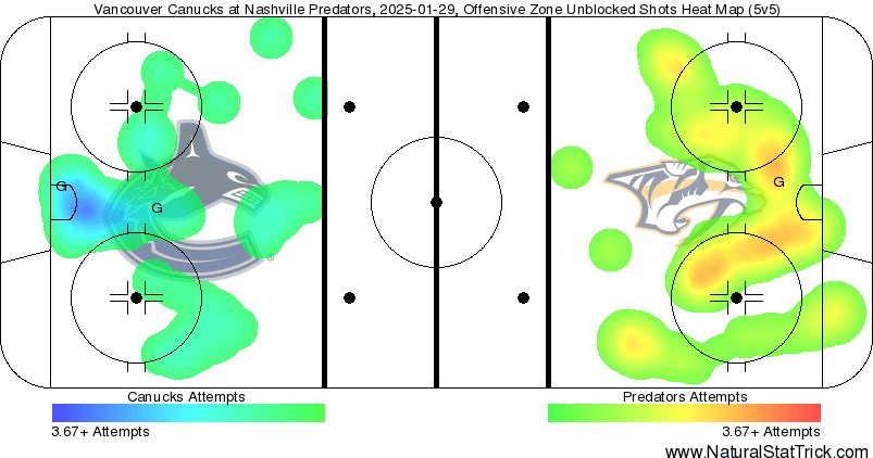 The heat map showed the good game that the Canucks had in their own end. While the Preds did secure a 25-16 lead in scoring chances at 5v5, their high-danger chance lead was just 9-7. Vancouver proportionally had more high-danger chances in relation to the total amount of scoring chances that they generated, while also limiting the raw number of Nashville’s high-danger looks despite having a pretty handy scoring chance advantage. Plus, with just one goal against, it was a deserved result for a very good game defensively. Vancouver did well to limit the Preds on the man advantage too, giving up just 1 high-danger chance against when Nashville had a powerplay, and just one more chance when they pulled the goalie for an extra attacker.