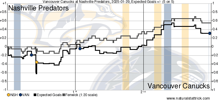 The game flow might look like it favoured the Preds by a decent chunk, but a glance at the Y-axis shows that their advantage was relatively minimal in terms of raw numbers. Generally speaking, this game was pretty back and forth, and that’s a testament to the Canucks being able to stay focused on the game itself and not get wrapped up in some of the extracurriculars. Vancouver only finished the first with a slight edge in xGF% and CF%, with the rest of the periods finishing in favour of Nashville – but, their advantage wasn’t too statistically significant, and that defensive effort the Canucks put in was very good indeed.