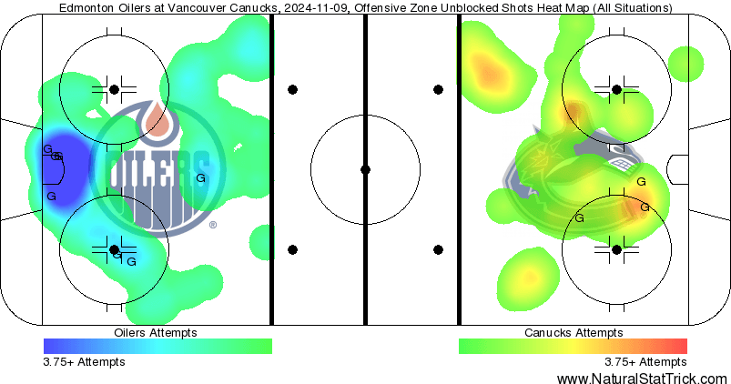 The heat map demonstrated a cumulation of a trend the Canucks were developing through their last stretch of games. Edmonton’s powerplay was always going to buoy their scoring chances, finishing at 26-17 and 17-2 high-danger chances across all situations. But the extent of their success at 5v5 should be concerning – the Oilers only had an 18-16 edge in scoring chances, but put up an 11-2 lead in high-danger chances. Giving up that many looks to an Edmonton team is rough, even if Connor McDavid isn’t at 100%. Sooner or later, with that many opportunities, any team would capitalize and make the Canucks pay for giving up that many grade A chances. As well, it is brutal that Vancouver still can’t generate any chances. 2 high-danger chances across an entire game are straight-up not good, and further compounding that was that the Canucks didn’t have a single high-danger chance on the powerplay – AGAIN. This time, it was against the league’s worst penalty kill.