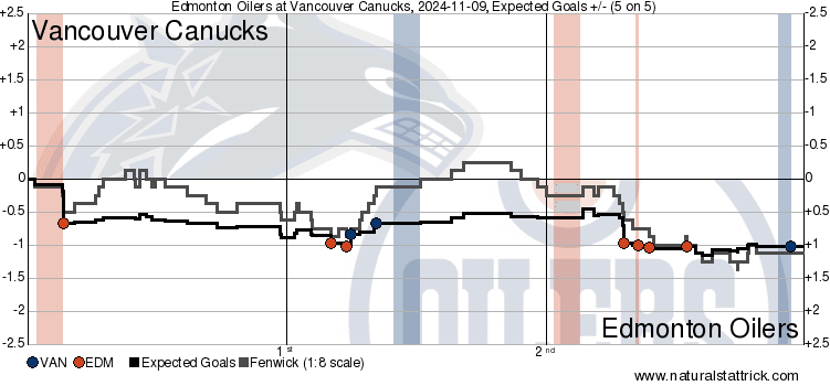 Honestly, if just looking at the game flow from just the first two periods, things didn’t seem that bad. Edmonton dictated the possession share in the first with 58.62 CF%, which translated to a dominant 85.70 xGF% share for them. They were able to carry that forth through the start of the second, capitalizing for a 3-0 lead, but Vancouver was able to dig themselves back and play their game in the middle frame. The Canucks would finish with a 58.88 CF% and 66.22 xGF%, showing a marked improvement by only conceding one high-danger chance against in the second after giving up six in the first. However, the third period was just a tirefire, with defensive breakdowns in quick succession leading to a massive 7-2 lead – but realistically, the Oilers weren’t playing any better than they were in the first period with 66.67 CF% and 67.94 xGF%.